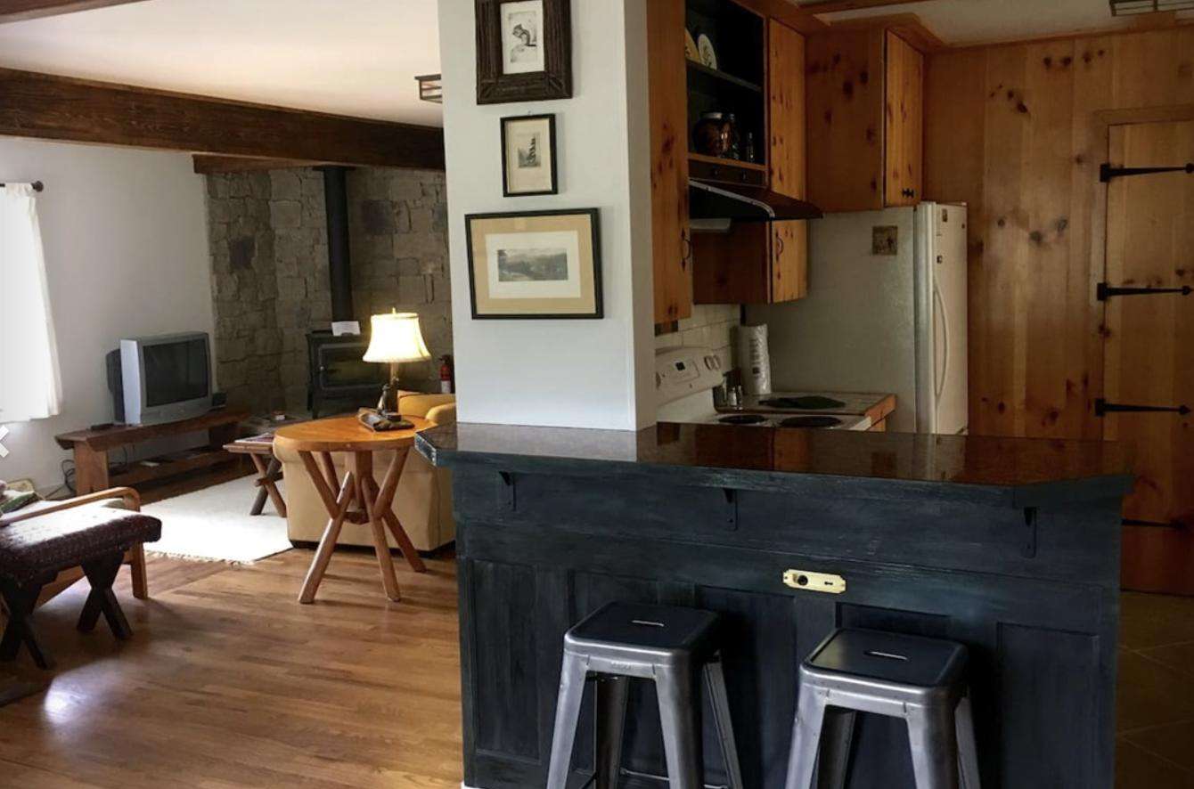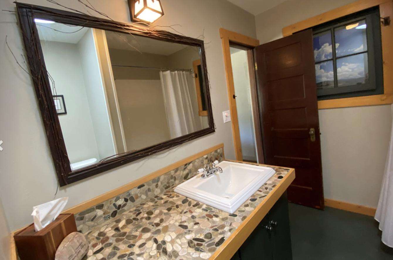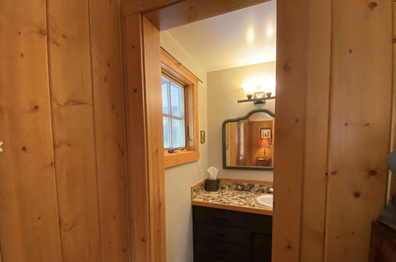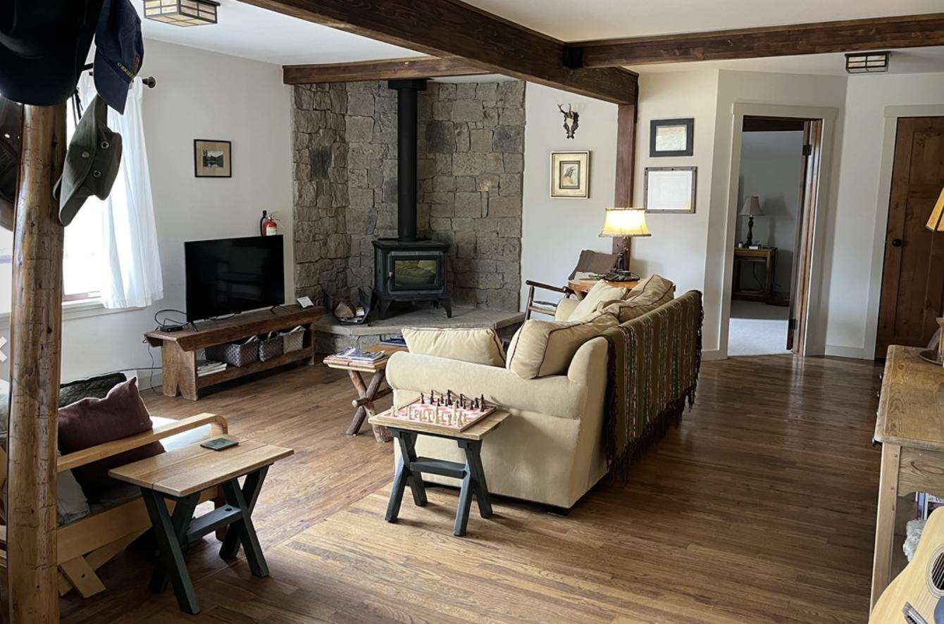 Inside, you’ll find warm personal touches and thoughtful details throughout. The home features a spacious primary bedroom with a California king bed, along with a second bedroom with a double bed and its own private half bath. A shared full bathroom with a tub/shower combination serves the home. The comfortable living room includes a wood-burning fireplace, Smart TV, inviting seating, and pleasant mountain views—perfect for relaxing after a day of adventure.